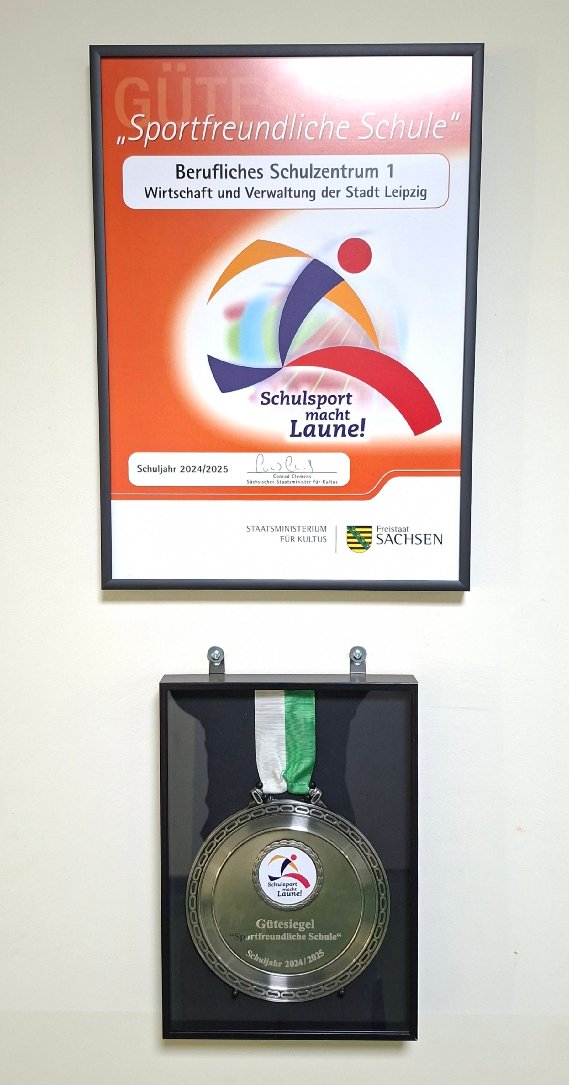 Eine besondere Ehre wurde dem BSZ 1 am 5. November 2025 zu teil. Unser Schulleiter Herr Bunese, der Fachkonferenzleiter Sport Herr Pattke und zwei Schüler unserer Schule bekamen vom Kultusminister Conrad Clemens das Gütesiegel „Sportfreundliche Schule“ in der Dresdner Ballsportarena verliehen.