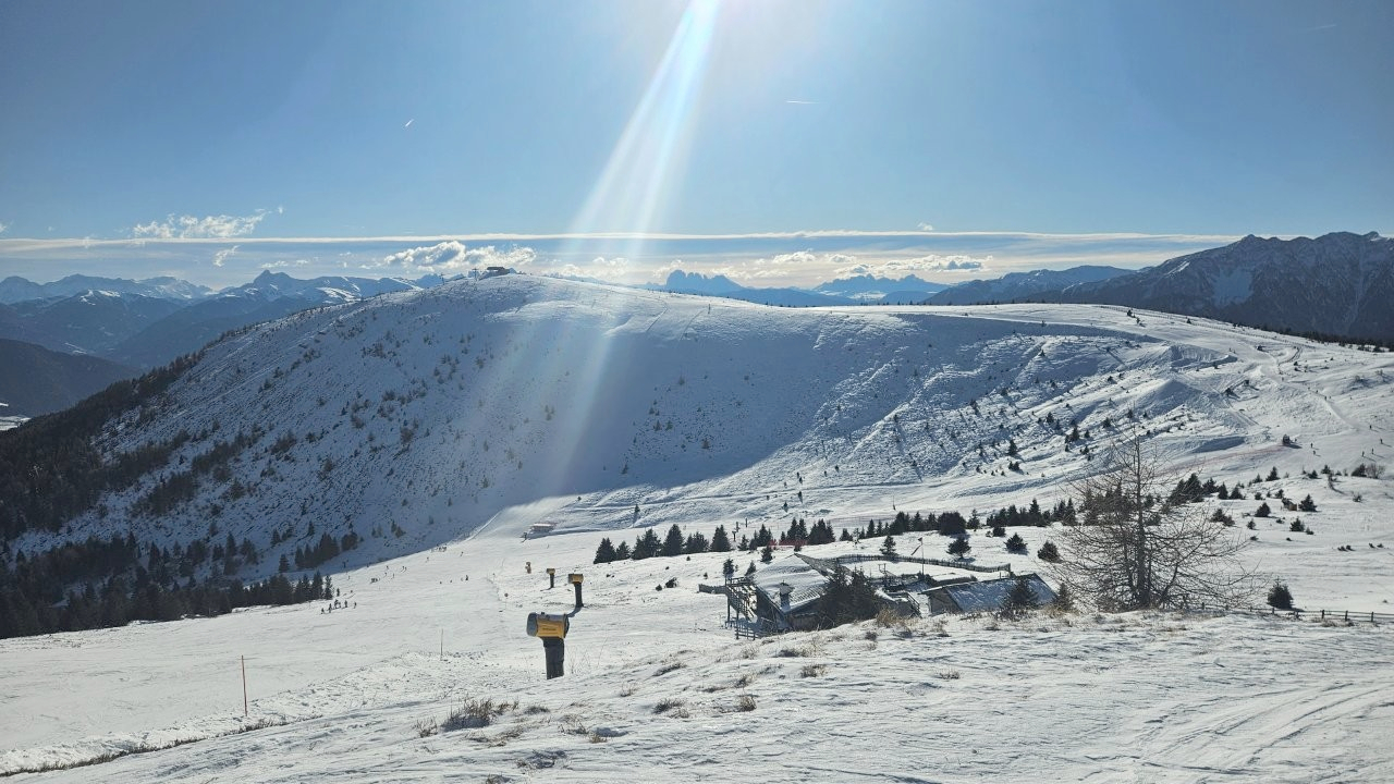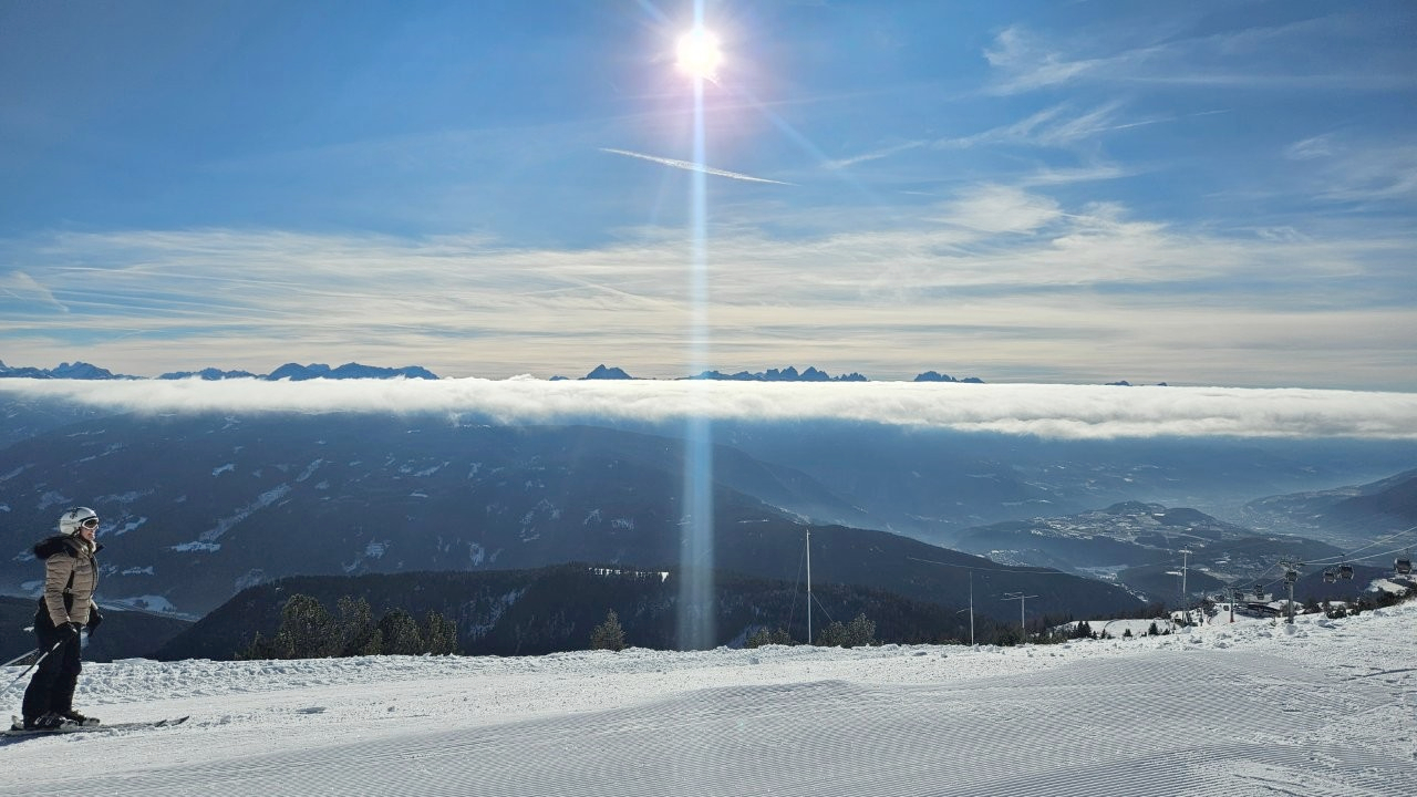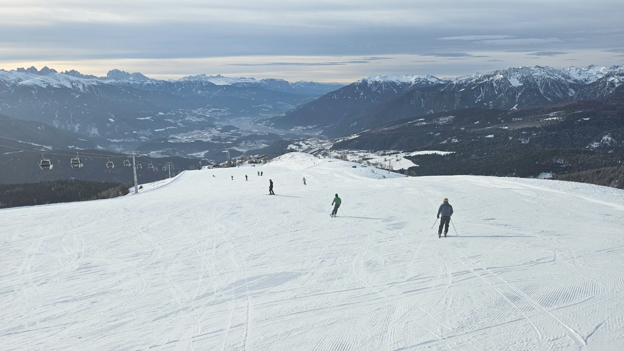 Tag Nummer zwei hieß für uns: Endlich Skifahren! Nach einem schmackhaften Frühstück mit lokalen Spezialitäten wie dem Südtiroler Schinken oder Mortadella machten sich alle auf ins Tal, um sich für das Ski-Abenteuer die richtige Ausrüstung zu besorgen. Einige hatten ihren eigenen Helm mitgebracht, andere sogar eigene Skier. Alle anderen waren im örtlichen Skiverleih bestens aufgehoben und wurden für die fünf Skitage mit allem versorgt, was es fürs Skifahren braucht: Skier, Helme, Skischuhe und Stöcke. Als alle perfekt ausgestattet waren, fuhren die zwei Fortgeschrittenen- bzw. Profigruppen sowie die zwei Anfängergruppen mit der Gondel hoch auf den Gitschberg, wo der erste Skitag voll ausgekostet wurde.